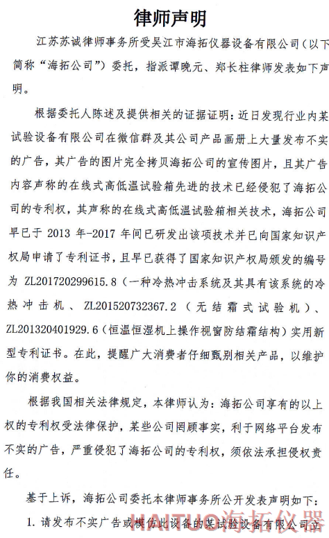 海拓儀器律師聲明:反對侵權(quán)行為 維護公司和消費者權(quán)益摘要:國內(nèi)試驗設(shè)備領(lǐng)先者吳江市海拓儀器設(shè)備有限公司委托律師事務(wù)所發(fā)布了律師聲明,該聲明指出,當(dāng)前市面上出現(xiàn)了產(chǎn)品專利侵犯海拓儀器權(quán)益,海拓儀器將以法律手段維護自身利益。該律師聲明要求某試驗設(shè)備有限公司立即停止侵權(quán)行為,扯下其在網(wǎng)絡(luò)平臺的相關(guān)廣告和宣傳畫冊并同時停止生產(chǎn)同款設(shè)備。如果該設(shè)備公司不聽勸解,海拓儀器將向人民法院依法起訴該公司侵權(quán)行為,以維護自身合法權(quán)益和維護客戶消費權(quán)益,并建議廣大消費者仔細甄別相關(guān)產(chǎn)品。? ? ? ?近日,吳江市海拓儀器設(shè)備有限公司委托律師事務(wù)所發(fā)布了律師聲明,該聲明指出,當(dāng)前市面上出現(xiàn)了產(chǎn)品專利侵犯海拓儀器權(quán)益,海拓儀器將以法律手段維護自身利益。??事件源起于海拓儀器發(fā)現(xiàn)市面上有同類設(shè)備公司通過完全拷貝海拓儀器產(chǎn)品宣傳圖片,在微信群及該公司產(chǎn)品畫冊上大量發(fā)布不實廣告。??聲明指出,該廣告聲稱的在線式高低溫試驗箱的技術(shù)侵犯了海拓儀器的專利權(quán),該產(chǎn)品專利由海拓儀器