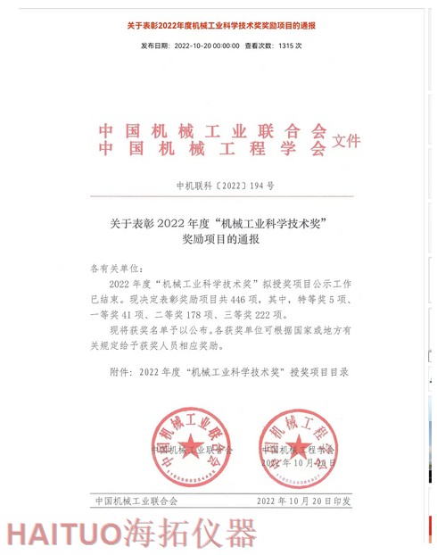 海拓儀器榮獲2022年度中國機械工業(yè)科學(xué)技術(shù)獎?ICC訊?10月20日,2022年度“中國機械工業(yè)科學(xué)技術(shù)獎”項目名錄正式發(fā)布,由海拓儀器(江蘇)有限公司完成的“超快速冷熱沖擊試驗系統(tǒng)關(guān)鍵技術(shù)研究與系列應(yīng)用”項目榮獲2022年度“中國機械工業(yè)科學(xué)技術(shù)獎”三等獎。??據(jù)了解,中國機械工業(yè)科學(xué)技術(shù)獎是根據(jù)《國家科學(xué)技術(shù)獎勵條例》和《社會力量設(shè)立科學(xué)技術(shù)獎管理辦法》的有關(guān)規(guī)定,由中國機械工業(yè)聯(lián)合會和中國機械工程學(xué)會共同設(shè)立并經(jīng)國家科學(xué)技術(shù)部批準(zhǔn),在國家科技獎勵主管部門登記的面向全國機械行業(yè)的綜合性科技獎項。旨在表彰在機械工業(yè)科技工作中作出突出貢獻的單位和人員,獎勵范圍包括:機械工業(yè)科學(xué)技術(shù)發(fā)明成果、機械工業(yè)科學(xué)技術(shù)進步成果、機械工業(yè)工程化和新技術(shù)推廣成果和機械工業(yè)軟科學(xué)和標(biāo)準(zhǔn)成果。??海拓儀器是一家集研發(fā)、制造、貿(mào)易于一體高科技現(xiàn)代化公司,公司成立于2005年,主要產(chǎn)品包括:超快速冷熱沖擊試驗機(熱流儀)、快速溫變應(yīng)力篩選試驗箱(ESS),